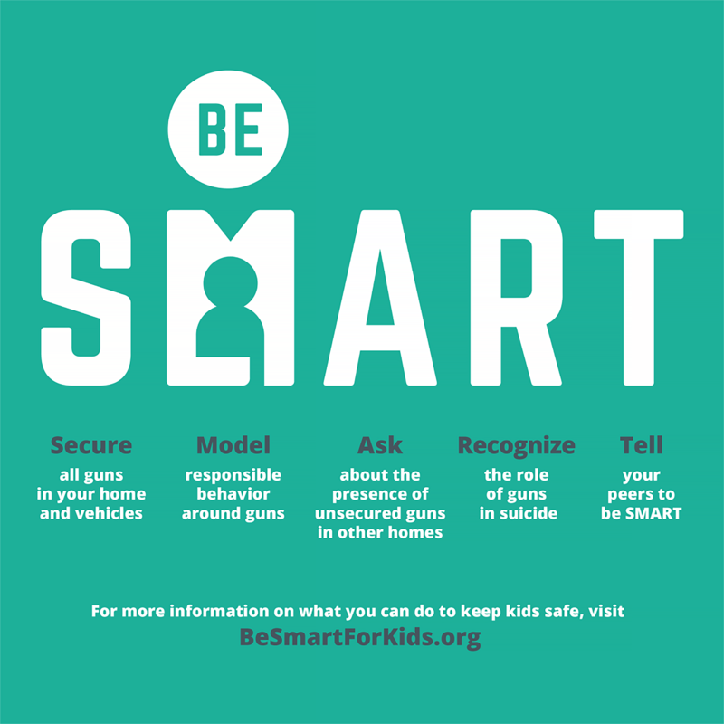 School districts have a vested interest in ensuring that firearms do not appear on school grounds and that students and staff are not negatively impacted by the effects of gun violence. The Be SMART campaign was launched to raise awareness that secure gun storage can save children’s lives. Be SMART emphasizes that it’s an adult’s responsibility to keep kids from accessing guns and that every adult can play a role in keeping kids and communities safer.